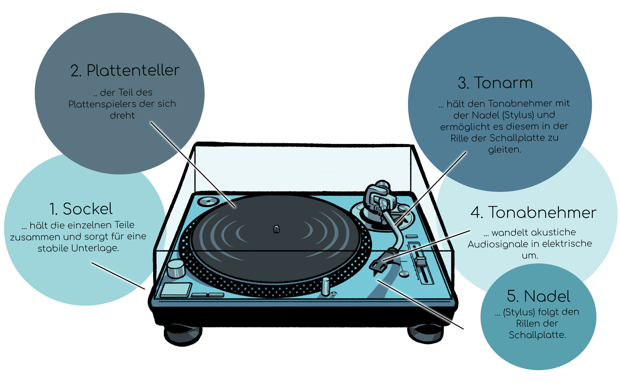 - Welche Funktionen haben die wichtigsten Bestandteile des Plattenspielers?